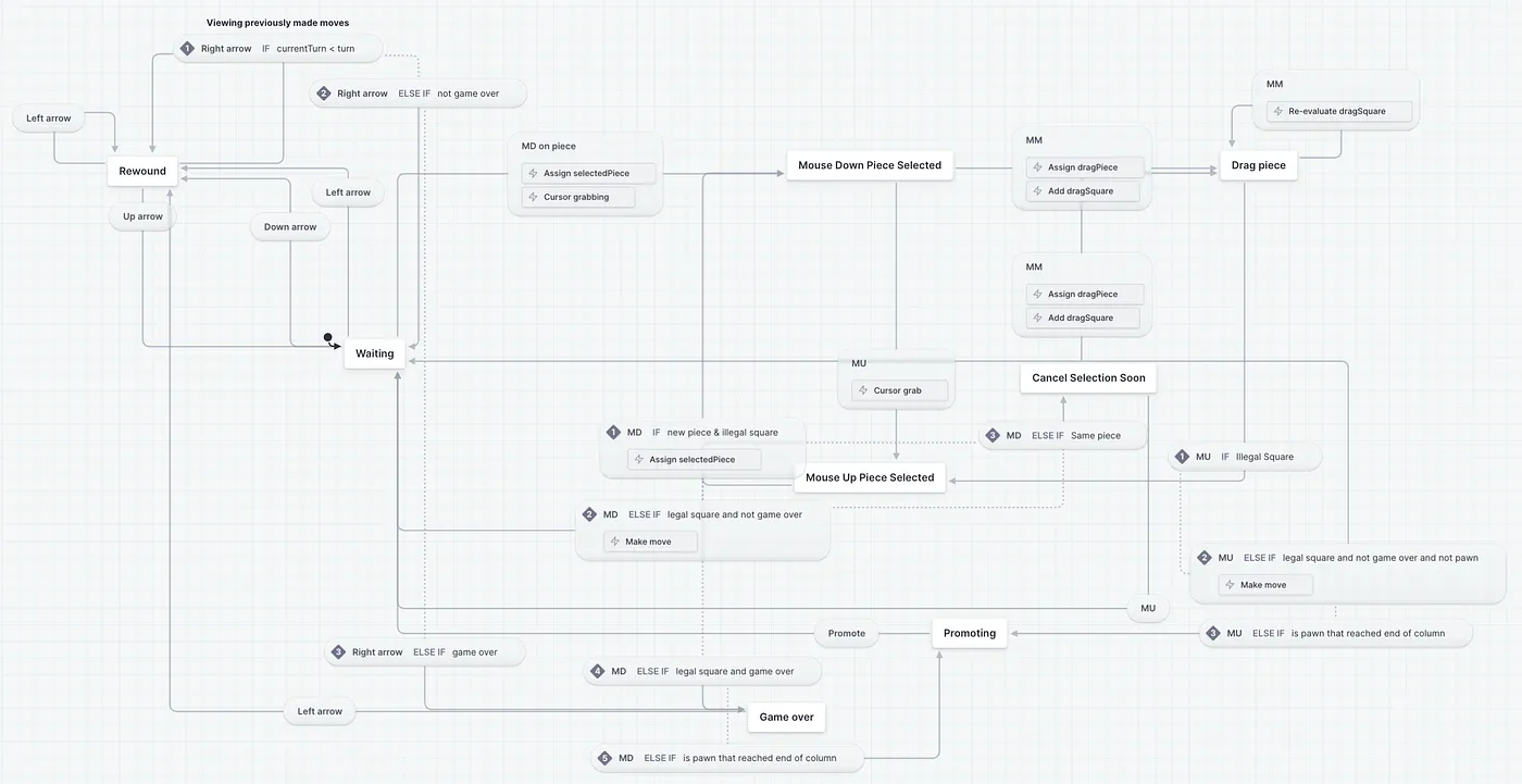 This is just with 3 events and 3 state variables. Lichess actually allows users to rewind and fast forward the game to see prior moves. What happens if the user clicks on a piece when they’re rewinding? What happens if the user clicks on a piece when it’s not their turn? What if they have a piece selected but click outside the board? And actually, turns out users want to be able to right click on square and drag to draw arrows and make commentary on other games…